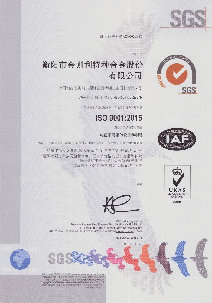 衡陽市金則利特種合金股份有限公司成立于一九九九年十二月,注冊資本人民幣兩千兩百萬元。注冊地址:衡陽市雁峰區白沙洲工業園長塘路2號。公司主營耐蝕軟磁合金,為湖南省高新技術企業。公司自成立以來,即致力于耐蝕軟磁合金的研發。 研制出的JL-31(00Cr13si2Pb)、JL-31B(00Cr13si2)、JL-31BS(00Cr13Si2S)、JL-37B(0Cr17Si2)、JL-37(0Cr17···